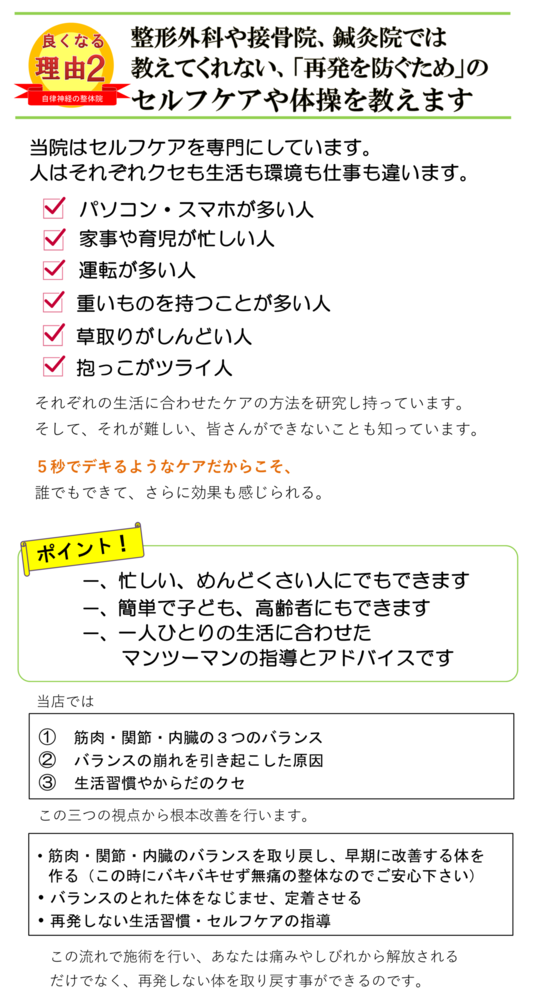 そのいずれも痛い場所ばかりを追って、全身のバランスに不可欠な「自律神経」に着目せずに体の歪みだけを原因にしています。体の歪みのほとんどは「筋肉」「内臓」「循環」などをコントロールする「自律神経の乱れ」という事実を基に生み出された、独自の理論が当院の施術です。これを受ける事ができるところは全国でも数少ないのです。