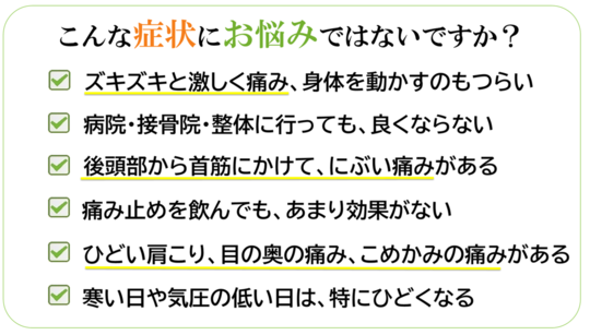 | 随伴症状 | 肩こり・首こり・目の疲れ・集中力の低下 |