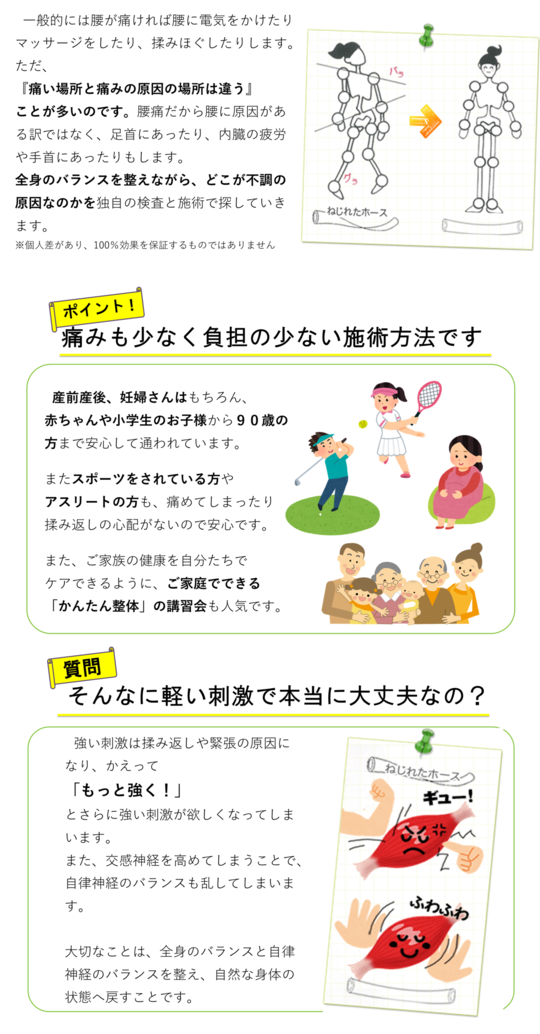 治療院に初めて行くときは、「わかってもらえなかったり、感じ悪かったり、強い営業があったらどうしよう…」などと不安に思うものですが、ふなこし先生の治療院では一切そのようなことはないので、そういった不安をお持ちの方にもお勧めしたいです。