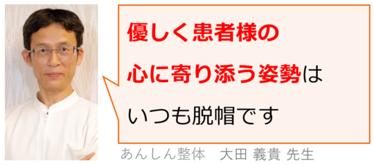 治療院に初めて行くときは、「わかってもらえなかったり、感じ悪かったり、強い営業があったらどうしよう…」などと不安に思うものですが、ふなこし先生の治療院では一切そのようなことはないので、そういった不安をお持ちの方にもお勧めしたいです。