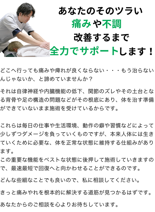 治療院に初めて行くときは、「わかってもらえなかったり、感じ悪かったり、強い営業があったらどうしよう…」などと不安に思うものですが、ふなこし先生の治療院では一切そのようなことはないので、そういった不安をお持ちの方にもお勧めしたいです。
